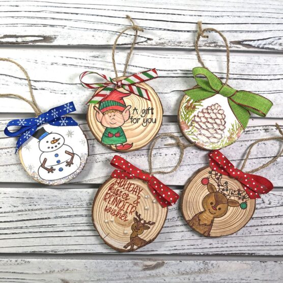 These rustic ornaments capture the beauty of nature with intricate burned designs on natural wood slices. The dark lines against pale birch or oak create stunning contrast, whether it’s delicate snowflakes or elaborate Christmas trees.