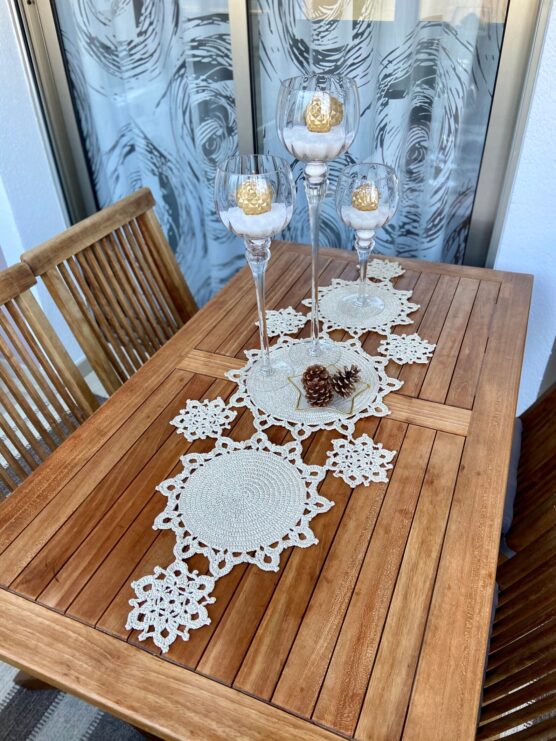 Intricate white cotton snowflakes connect to create stunning lace-like runners that transform your holiday table. The delicate openwork patterns cast beautiful shadows and let your table’s wood grain show through.