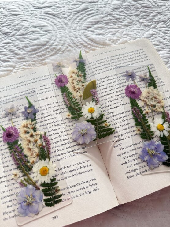 Delicate real flowers preserved between layers of clear material create bookmarks that feel like captured pieces of summer. Pink roses, purple pansies, or white baby’s breath maintain their natural beauty while becoming functional art.