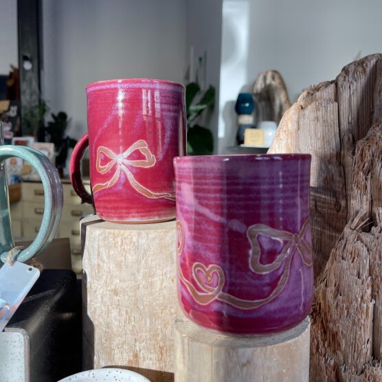 Custom pottery mugs glazed in deep holiday colors feel so warm and substantial in your hands. Whether finished in rich burgundy, forest green, or creamy white with speckled texture, each mug has its own personality from the potter’s wheel.