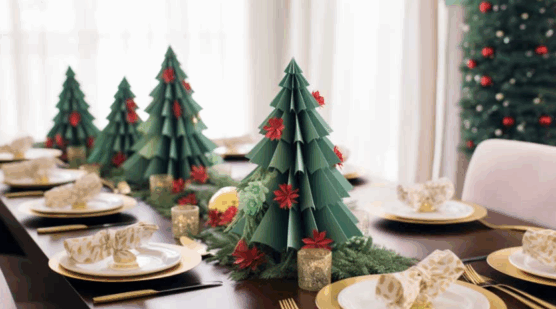 These stand-up trees add dimension to your holiday display. Cut out multiple tree shapes from green cardstock in graduated sizes. Stack and glue them together with small spacers in between, or fold each tree in half and glue the halves together to create a dimensional effect. The layered look gives them a full, realistic appearance.