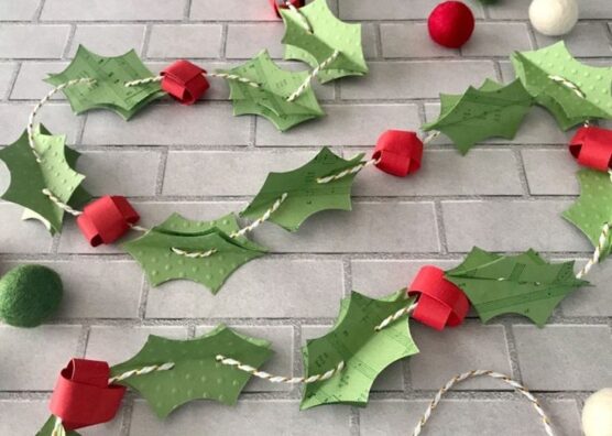 Holly leaves and berries are Christmas classics. Cut leaf shapes from green paper, making sure to include the characteristic pointed edges that holly leaves have. Group three leaves together and add small red paper circles as berries in the center. String these holly clusters together with thread or glue them onto a paper strip to create a garland.