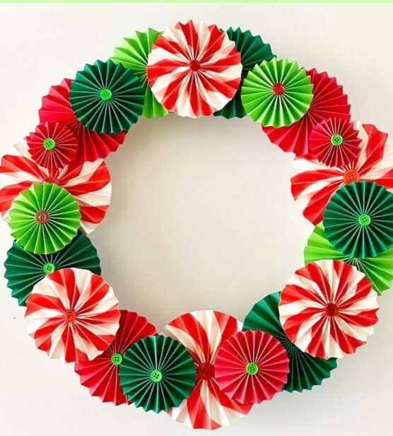 These dimensional wreaths have a flower-like appearance. Create paper rosettes by accordion-folding strips of paper, then joining the ends to form circles. Flatten them slightly and arrange multiple rosettes in a circular pattern on a cardboard base. Use different shades of green for depth, and add red rosettes as berries. The layered, textured look is sophisticated and eye-catching.