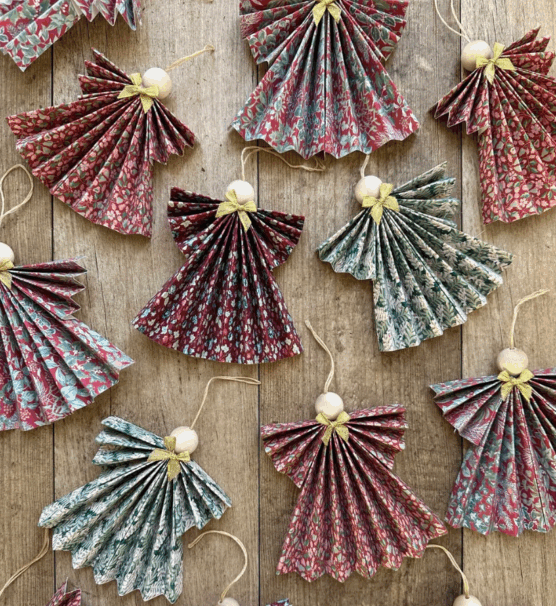 A paper halo completes the heavenly look. These angels can stand on surfaces or hang from the tree. The pleated wings catch the light beautifully and add movement when they sway. Make them in white, gold, or pastel colors for different effects.