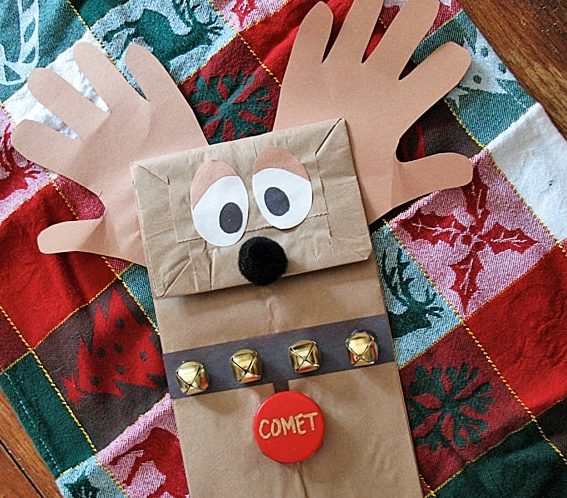 Brown paper lunch bags become adorable reindeer puppets in minutes. Keep the bag folded flat and decorate the bottom flap as the reindeer’s face. Glue on googly eyes, a red pom-pom or paper nose, and construction paper antlers. The mouth of the bag becomes the puppet’s mouth when you slip your hand inside.