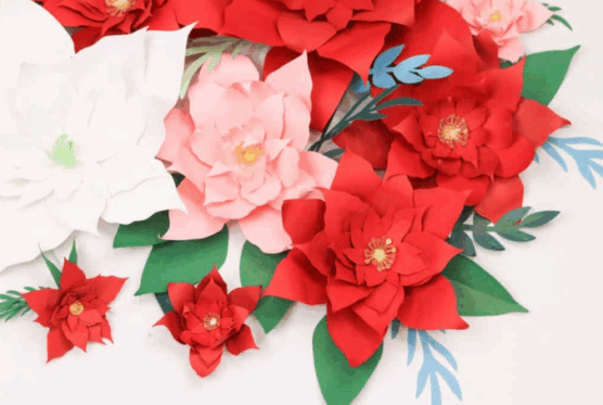 These festive flowers brighten any space. Cut petal shapes from red, pink, or white paper, making some larger than others. Layer the petals in a circular pattern, with the largest on the bottom, creating a flower shape. Glue a yellow paper circle or button in the center. The layered petals create realistic dimension. Attach these flowers to wreaths, garlands, or gift boxes.
