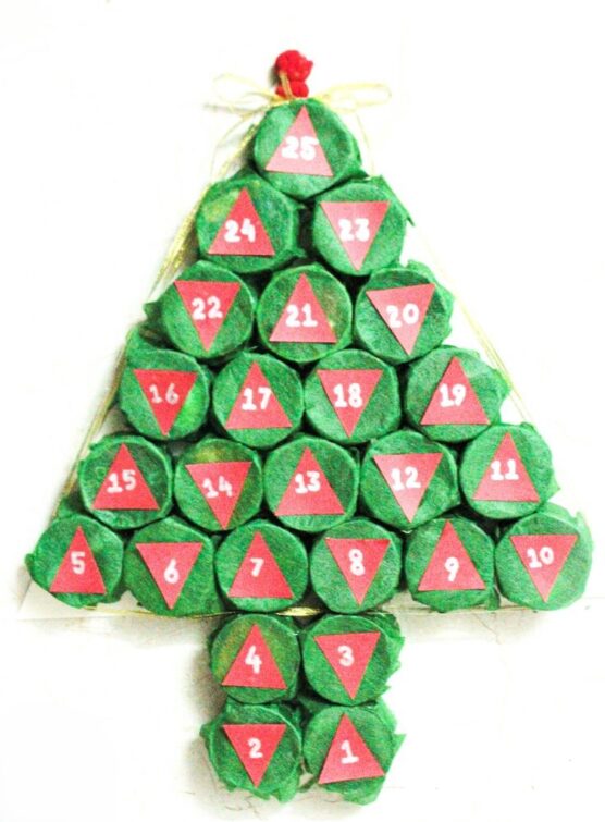 Turn simple toilet paper rolls into a fun and festive advent calendar! Gather 24 empty rolls and paint them green. Once dry, arrange them in a large triangle shape on a sturdy board or piece of cardboard, starting with six rolls at the base, then five, four, three, two, and one at the top to form a tree. Fill each roll with a small treat, note, or trinket, then cover the front with numbered paper circles (1–24).