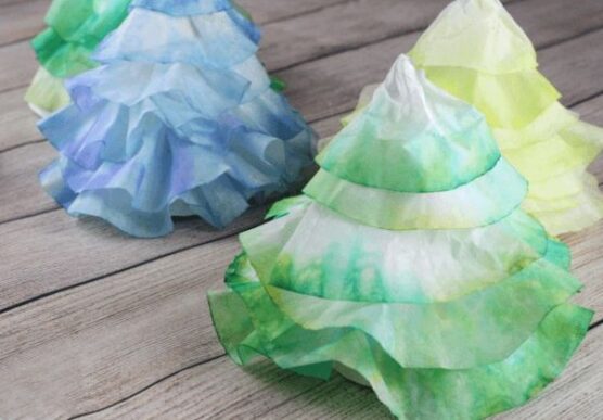 Once stacked in a cone shape, spray or brush them with diluted green food coloring or watercolor. The filters absorb the color beautifully and create a soft, feathery texture. Add tiny beads or glitter for ornaments while the filters are still slightly damp.