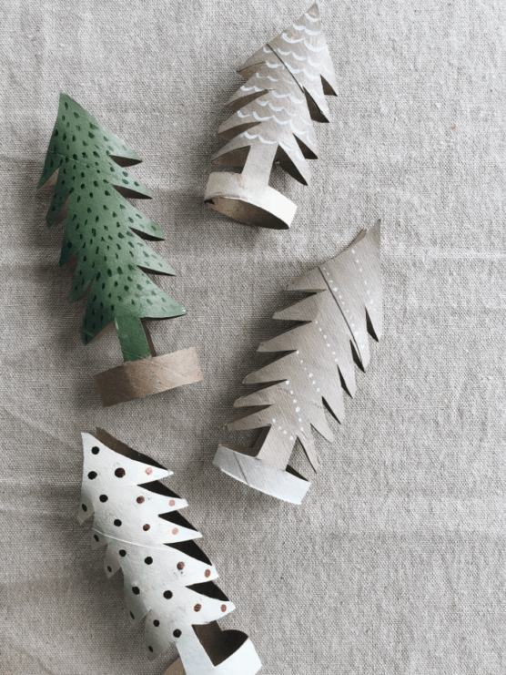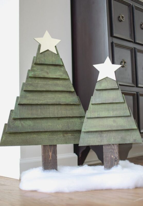 Create a simple yet charming tree decoration using cardboard. Cut out two identical tree shapes from sturdy cardboard, then make a vertical slit halfway down the center of one piece and halfway up the other. Slide them together to form a standing 3D tree. Paint the tree in festive colors, classic green, white, or even metallic gold for a modern touch.