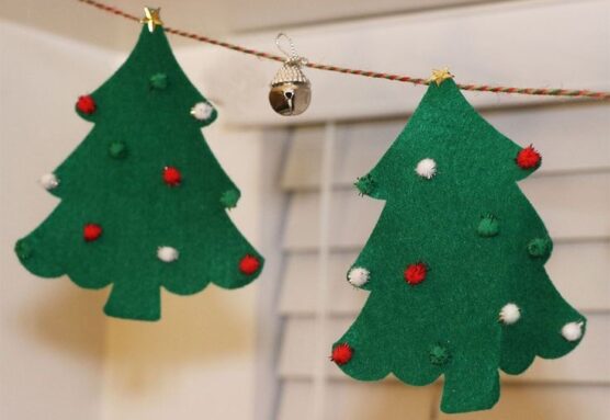 Cut triangle tree shapes from green felt in various sizes. Layer two or three shades of green for visual interest. Decorate each tree with small felt circles, stars, or other shapes in bright colors like red, yellow, and pink. Stitch or glue these decorations onto the trees.
