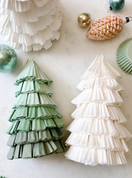 Flatten cupcake liners in green or white. Cut them in half. Stack the half-circles on top of each other on a piece of cardstock, overlapping them slightly to form a tree shape with layers. Start with larger halves at the bottom and use smaller ones as you work up. Glue each layer down. The ruffled edges create a textured, fluffy appearance. Add small rhinestones, sequins, or drawn ornaments for decoration.