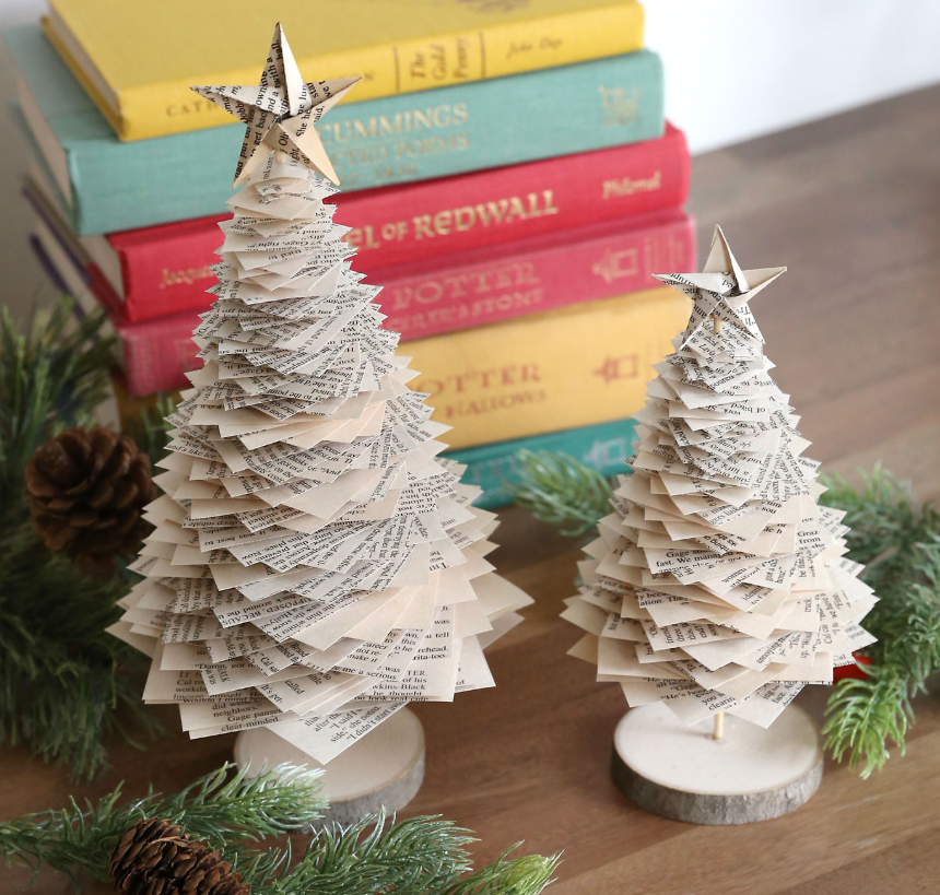 The text and aged paper give it a vintage, literary feel. You can leave the pages as-is for a shabby chic look or lightly spray with gold paint for sparkle. Add small red berries or a red ribbon bow for a pop of color. These trees are perfect for book lovers and add an intellectual, cozy touch to your holiday decor.