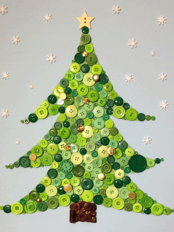 Sketch a simple Christmas tree outline on a small canvas with pencil. Fill in the tree shape by gluing buttons in various shades of green all over it, overlapping them slightly for full coverage. Mix different button sizes for texture and dimension. Add a few red, gold, or silver buttons scattered throughout as ornaments. Use brown buttons or paint a small trunk at the bottom.