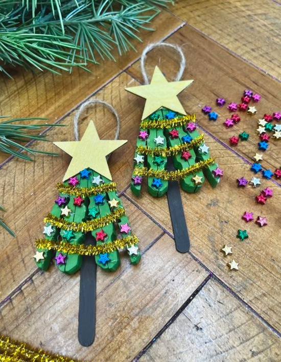 Clip tiny ornaments, bells, or ribbon bows to the clothespins. Add a ribbon loop at the top for hanging. The spaces between the clothespins create an open, airy design that’s quite elegant. You can also clip on small photos or holiday messages for a personalized touch.