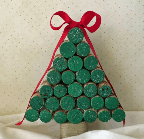 Collect wine corks and glue them together in a pyramid shape, starting with a base of four or five corks. Layer additional rows on top, decreasing the number in each row until you end with a single cork at the peak. Paint the entire structure green once the glue is dry.