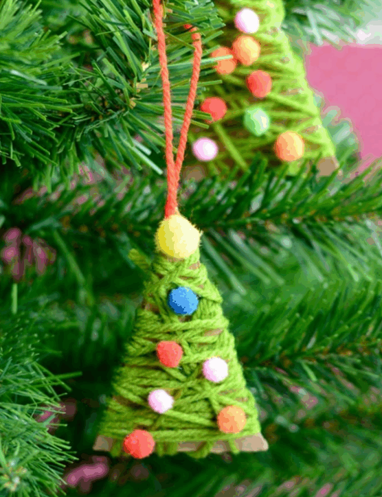 Cut Christmas tree shapes from sturdy cardboard using a template or freehand. Punch a small hole at the top for hanging. Wrap green yarn around the tree shape, starting at the bottom and working up, securing the end with a dab of glue. The yarn should cover the cardboard completely.
