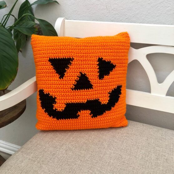 This pillow cover brings the classic Halloween pumpkin indoors with a grinning jack-o’-lantern face on bright orange background. The facial features can be appliquéd on in black or worked directly into the pattern for raised texture. A hidden zipper on the back makes it easy to remove for washing while keeping the pillow insert secure. The orange is vibrant and cheerful, making it a happy addition to sofas or beds during October. Size it to fit standard throw pillows for easy decorating.