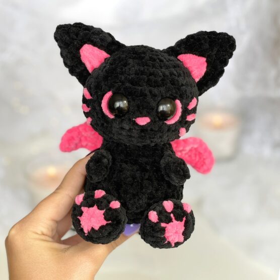 This sleek black cat sits with perfect posture, tail curled around its paws in classic feline fashion. The smooth black yarn gives it a lustrous coat that begs to be petted, while bright green or yellow safety eyes add that mysterious cat stare. A tiny pink nose and whiskers made from embroidery thread complete the look. Size it small for a shelf decoration or large enough to be a cuddly companion. The pointed ears and long tail give it that unmistakable Halloween cat silhouette.