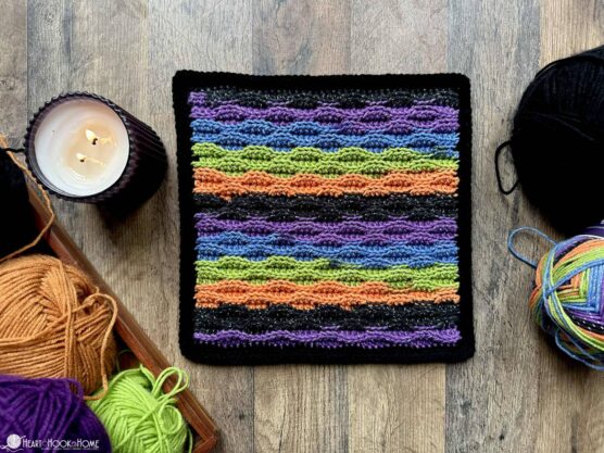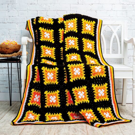 This cozy throw captures the iconic Halloween candy in soft, snuggly form. The white, orange, and yellow stripes work up in satisfying sections that make the project feel manageable even when you’re making it blanket-sized. The colors blend beautifully together, creating a warm autumn palette that works beyond just Halloween. It’s the perfect weight for October evening snuggles while watching scary movies. The bold stripes make it a striking addition to any living room.