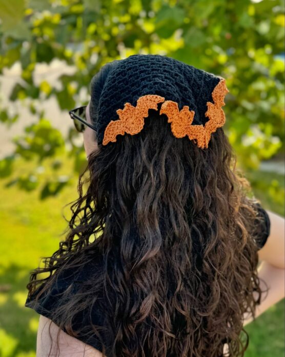 This stylish headband features small bats that appear to be flying around your head in a whimsical pattern. The headband itself is comfortable to wear for extended periods, while the dimensional bat elements add playful movement. Worked in black with the bats slightly raised from the band surface, it creates subtle texture and visual interest. It’s sophisticated enough for adult wear but fun enough that kids will love it too. The bats cast tiny shadows that add to the spooky effect.