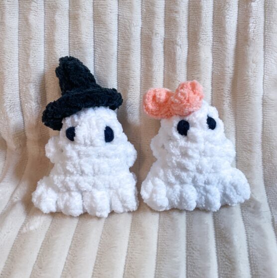 These palm-sized ghosts are incredibly endearing with their simple white bodies and sweet facial expressions. Each one has a slightly different personality – some look surprised, others mischievous, and a few appear to be saying “boo!” Their flowing bottom edges give them that classic ghost shape while the weighted bottom helps them sit upright on shelves. Made in soft white yarn, they have a comforting rather than frightening presence. Perfect for scattering around the house for subtle Halloween touches.