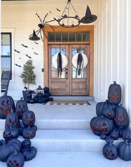 Pumpkins painted in various spooky designs and placed along walkways create a welcoming yet eerie entrance to your Halloween display. Unlike carved jack-o’-lanterns, painted pumpkins last much longer and offer unlimited design possibilities – from classic orange with black accents to completely black gourds with metallic details.
