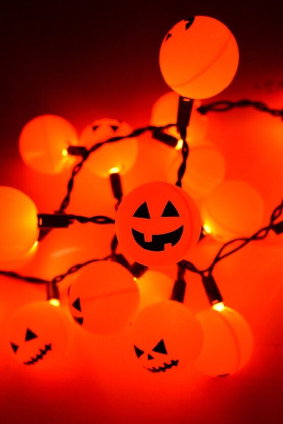 Create a strand of glowing jack-o’-lanterns by carving small foam craft pumpkins or simply painting ping pong balls with classic grinning faces. Slip them over orange string lights, and you’ll have a playful, weather-resistant decoration that lasts the entire season.