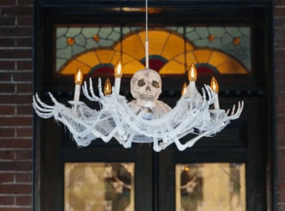 Craft a macabre yet eye-catching centerpiece by transforming plastic bones or lightweight skeleton parts into a hanging chandelier. Suspend rib cages, femurs, and skulls from a circular frame or repurposed metal hoop or let them dangle at varying lengths for a layered effect.