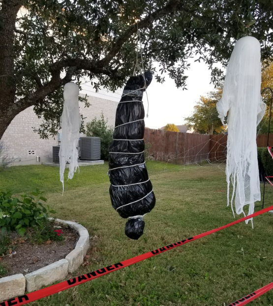 Black garbage bags stuffed with newspaper or leaves and shaped into arms, legs, and torsos create disturbing crime scene evidence scattered around your yard. The irregular shapes suggest something terrible has happened, while their placement in flower beds or behind trees implies someone tried to hide the evidence.