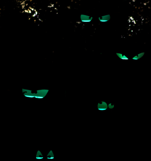 Toilet paper tubes painted black with glow-in-the-dark paint inside create pairs of mysterious eyes peering out from dark shrubs and bushes. The cylindrical shape focuses the glow into realistic eye-like beams that seem to track movement as people walk by.