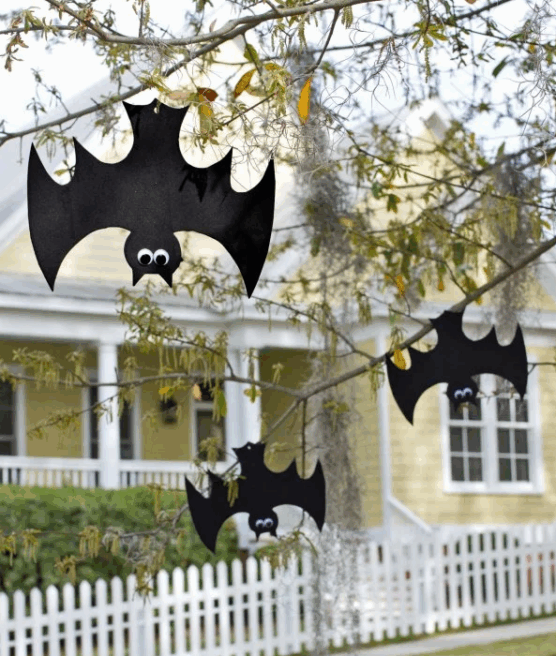 Black cardboard or foam bats in various sizes suspended from tree branches create a swirling colony that seems to have taken residence in your yard. Different lengths of fishing line make them hang at varying heights, creating depth and movement that suggests they might take flight at any moment.
