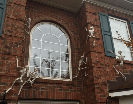 A plastic skeleton positioned to look like it’s scaling your house exterior creates a dramatic focal point that’s visible from far away. Secure attachment points make it appear to be desperately clawing its way to an upper window or roof, suggesting it’s trying to escape something even worse below.