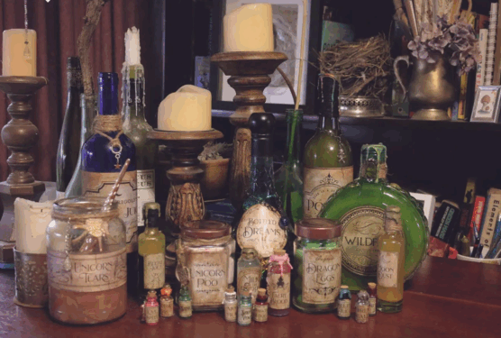 Different bottle shapes suggest different magical purposes, from love potions in heart-shaped containers to poison in old medicine bottles. The translucent nature allows for creative lighting effects, while the liquid movement when touched adds an interactive element that invites closer inspection from curious visitors.