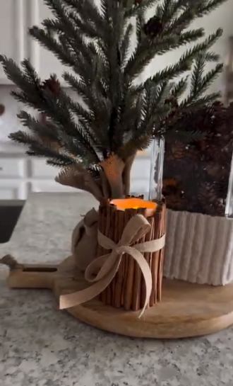 Take those battery-operated pillar candles and wrap them with real cinnamon sticks for a fragrant and beautiful display! Just hot glue the cinnamon sticks around the candle, securing them with twine or ribbon.