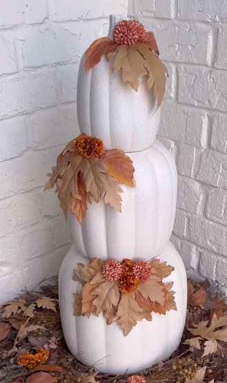 You can paint the pumpkins to match your décor, or leave them natural orange. Add some artificial fall leaves or berries around the base for extra color. This creates such a sophisticated look for your entryway or dining room, and it’s surprisingly sturdy once assembled.