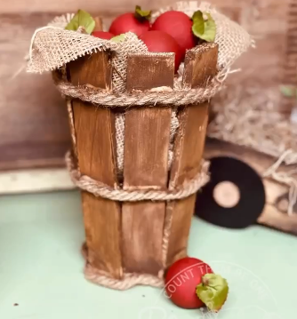 Create adorable mini apple baskets using small container, wooden shims and jute rope! Glue the shims around the outside of the container and wrap it with layers of jute rope. Use brown and black paint to give it a weathered, rustic finish.