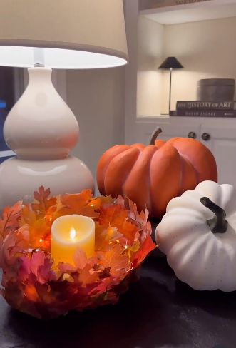 Grab some foam pumpkins from Dollar Tree and transform them into an elegant centerpiece! You can paint them in metallic colors like gold or copper, or wrap them in burlap for a rustic look. Add some battery-operated fairy lights around the base and scatter in some artificial fall leaves.