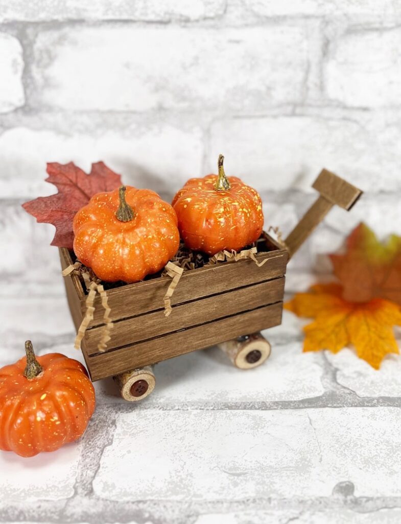 Combine small wooden crate and other items to create an adorable wagon display! Attach wheels (you can use wooden stems from Dollar Tree) and add a handle. Add brown crinkled paper shreds to resemble hay then fill the wagon with mini pumpkins and fall leaves.