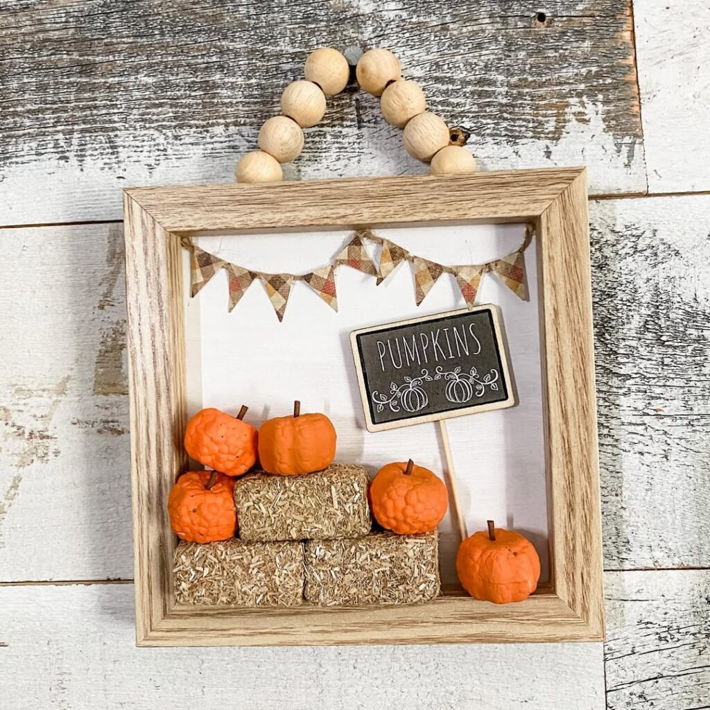 Create a mini hay bale display for a charming rustic touch! Start with a wooden frame, paint the background and arrange mini hay bales along with tiny pumpkins. Add a pumpkin patch sign and finish it off with extra autumn accents of your choice like leaves, ribbons, or small scarecrows for a festive and personalized look.