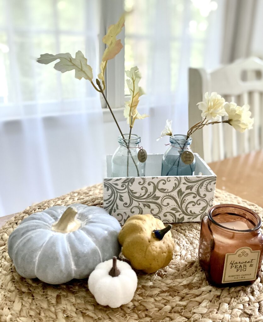 Surround the tray with mini pumpkins and candle to elevate the look. The mix of textures creates such visual interest, and the neutral colors work with any decorating style. This centerpiece looks like it could cost $50 at a boutique, but you can make it for under $15!