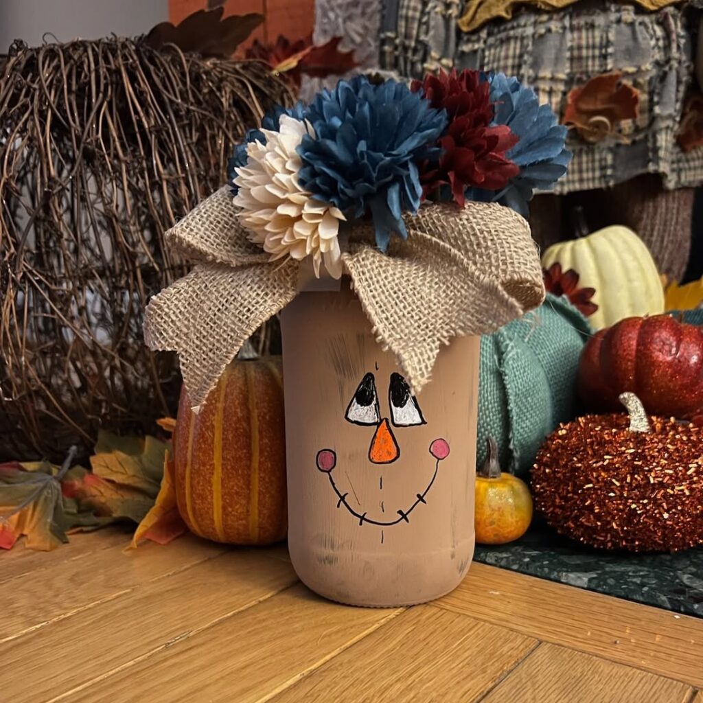 Turn regular mason jars into adorable scarecrows! Paint the jars with faces, add burlap or fabric scraps for clothing, and top with small straw hats from Dollar Tree. These make the cutest decorations for your mantel, shelves, or as part of a larger fall display.