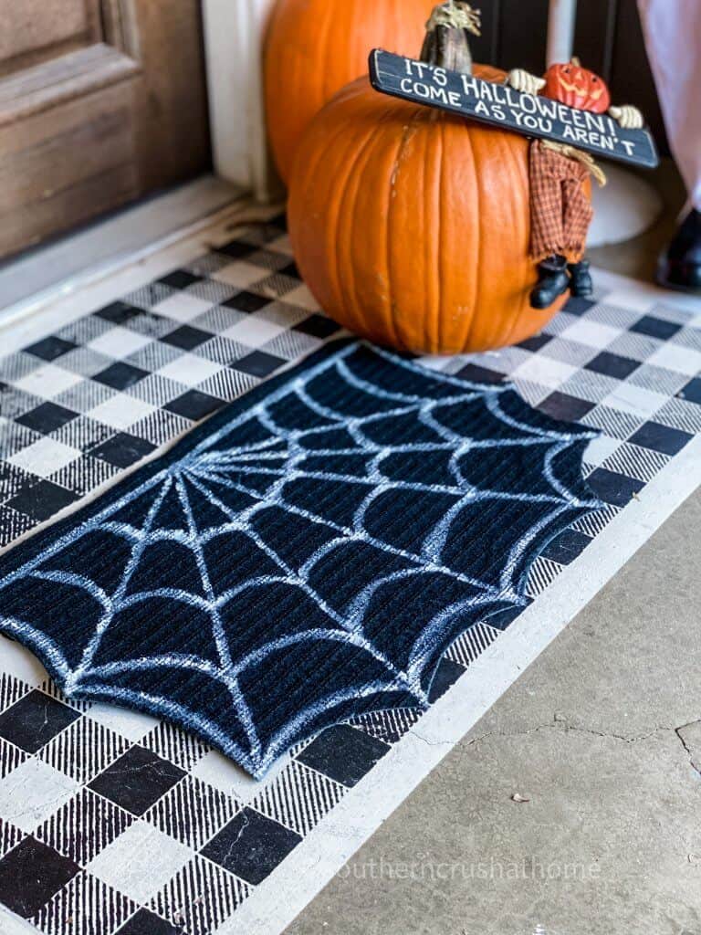 Create a spooky Halloween doormat using a plain mat from Dollar Tree! Use glow-in-the-dark paint or regular white paint to create a spider web design. Cut the curved edges and add plastic spiders for extra effect.