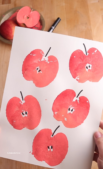 Fresh apple halves create perfect star-shaped stamps when dipped in paint and pressed onto paper. The natural star pattern from the apple’s core makes beautiful repeated designs in red, green, and yellow.