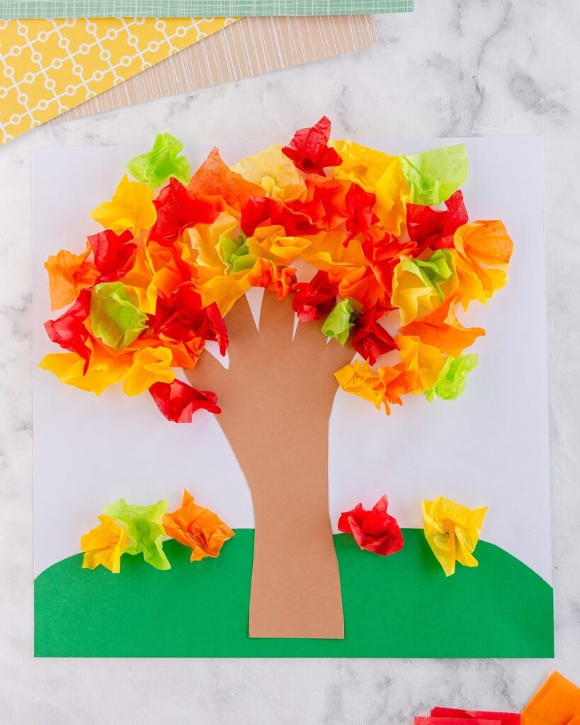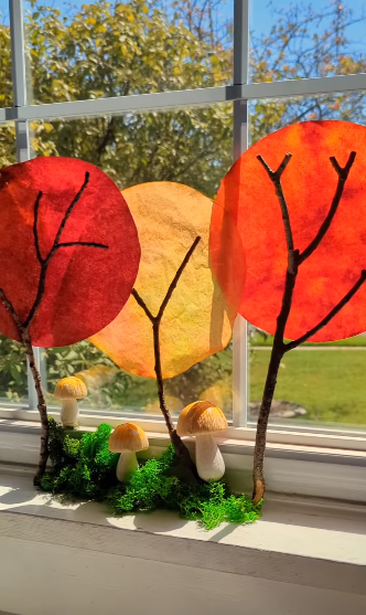 Fluffy tissue paper creates soft, cloud-like tree tops in warm autumn shades that seem to glow from within. The crinkled texture gives these trees such dimension and movement, like real foliage rustling in fall breezes.