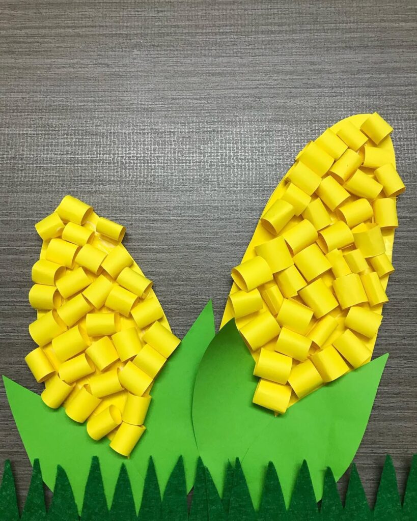 Bright yellow construction paper kernels arranged in neat rows create cheerful corn that looks good enough to eat. The geometric pattern of kernels has such a satisfying, organized look while green husks add natural contrast.