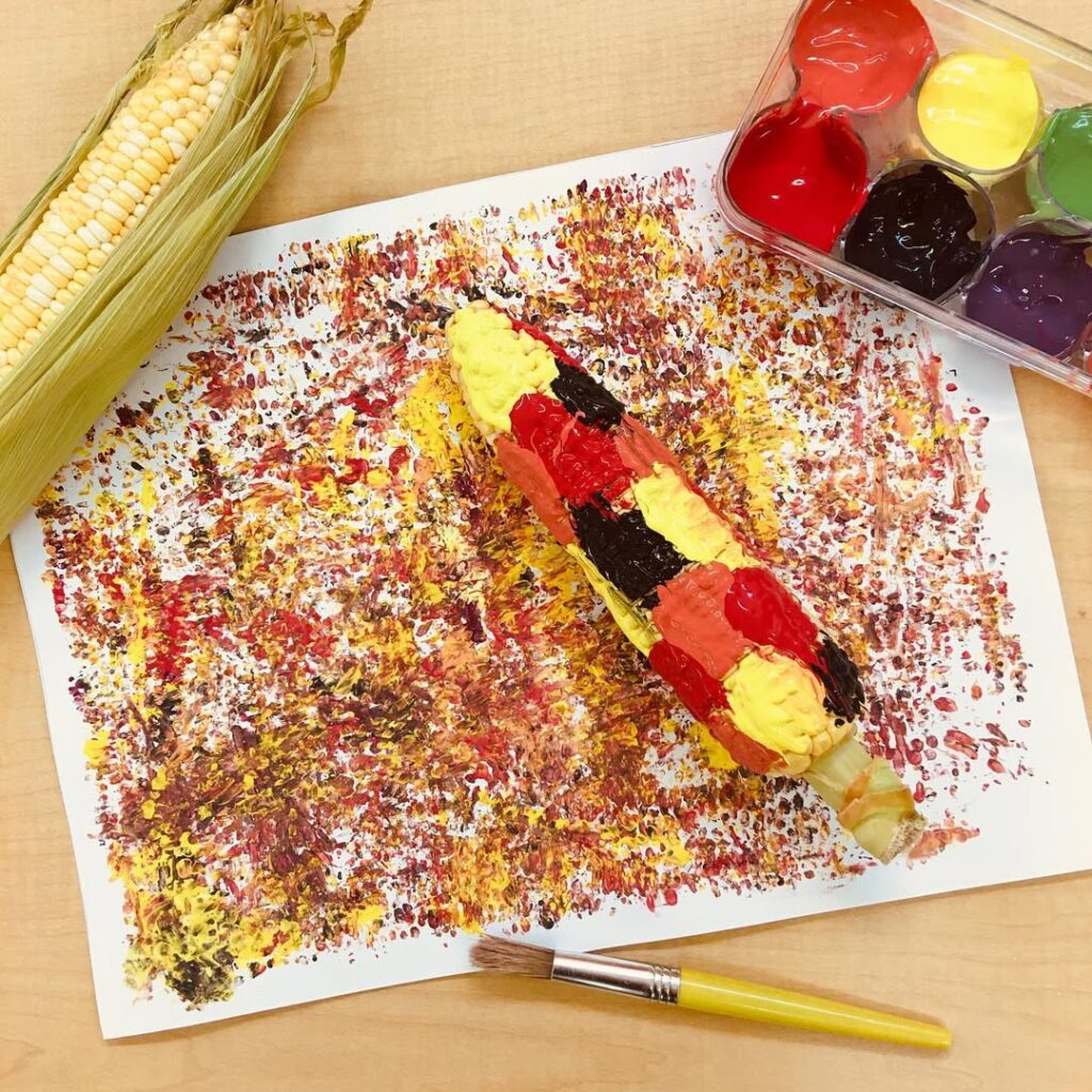 Using real corn cobs as paintbrushes creates the most interesting textured patterns on paper. The kernels leave behind dotted trails and bumpy textures in warm fall colors that look almost like abstract art.