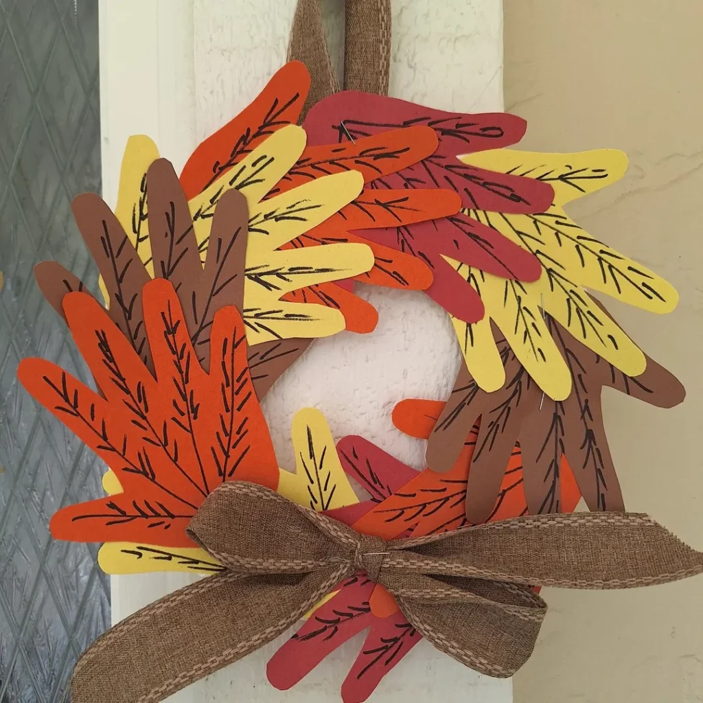 Create a charming fall wreath by cutting the center out of a paper plate to form your base. Have kids trace their hands on colorful autumn paper—think oranges, reds, and yellows—then cut out the handprints. Glue these handprint “leaves” all around the paper plate rim, overlapping them for a full, leafy look.