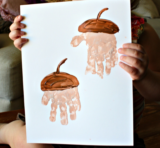 Little handprints become the perfect acorn caps in rich brown paint, paired with oval acorn bodies in warm tan colors. The natural curve of small fingers creates realistic acorn cap textures, while the simple oval shape below completes these woodland treasures. Each handprint acorn is unique, creating a sweet keepsake that combines nature’s design with your toddler’s special touch.