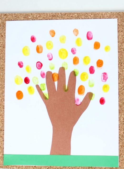A sturdy brown handprint becomes the trunk and branches of a magnificent autumn tree, while tiny fingerprints create a canopy of colorful leaves.