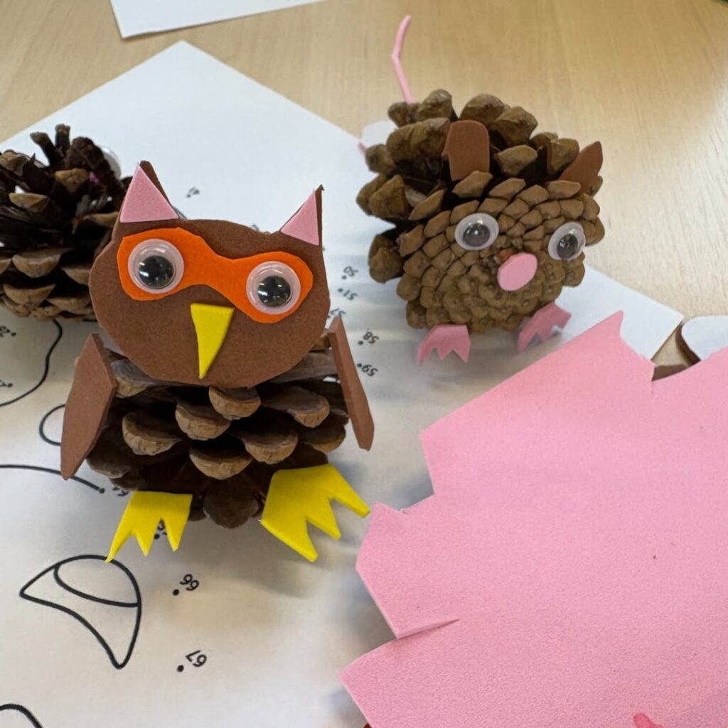 The natural brown texture of pinecones provides perfect animal bodies, and those bouncy googly eyes bring each creature to life with silly expressions. These little friends look like they’re ready to scamper through autumn forests.
